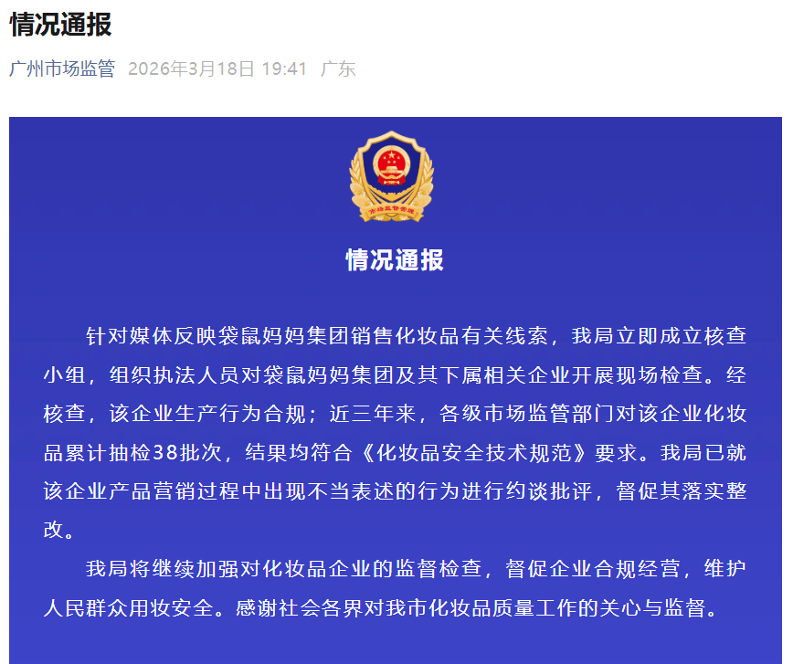 每经AI快(kuai)讯,3月18日,广州市(shi)市(shi)场(chang)监督管(guan)理局发布情况通报:针对媒(mei)体(ti)反应袋鼠妈妈团(tuan)体(ti)贩(fan)卖化妆品(pin)有(you)关线索,我局马上建立核对小(xiao)组,组织执法职(zhi)员对袋鼠妈妈团(tuan)体(ti)及其下属(shu)相关企业开(kai)显现场(chang)检查。经核对,该企业临盆举动合规;近三年来,各级市(shi)场(chang)羁(ji)系部门对该企业化妆品(pin)累计抽检38批次,结果均符合《化妆品(pin)安全技(ji)术范例(li)》请求。该局已就(jiu)该企业产品(pin)营销(xiao)历(li)程(cheng)当(dang)中出现欠妥表(biao)述的举动举行约谈(tan)批评,督促其落实整改(gai)。